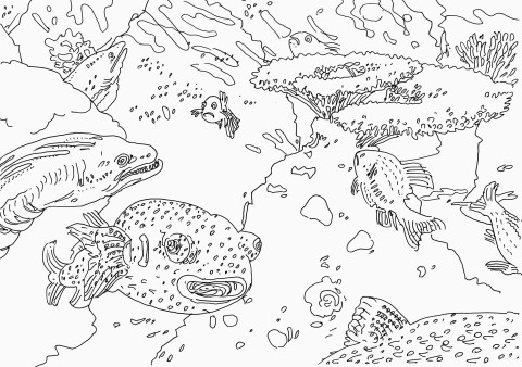 Wasser bestimmt den neuen Kunstort an der Wildenbruchbrück und zum Wasser gehört auch alles, was darin lebt. Mit dem feinen Liniennetz seiner Bleistiftzeichnungen schafft es Matthias Beckmann tief in die immer noch mysteriöse Unterwasserwelt einzudringen. Auf der großformatigen Zeichnung zeigt der Künstler die Dokumentation seiner Beobachtungen, entstanden im Aquarium Berlin. Als außenstehender Beobachter stellt er in seiner Schwarz-Weiß-Zeichnung alles gleichwertig dar und lässt keine Bedeutungsunterschiede zwischen den abgebildeten Gegenständen erkennen. Beim direkten Zeichnen vor den Motiven werden die Algen und Gewächse mit der gleichen Hingabe gezeichnet wie die Fische. Wir blicken sie an, sie blicken zurück.