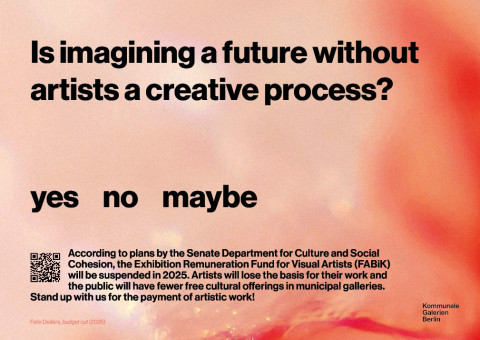 According to plans by the Senate Department for Culture and Social Cohesion, the Exhibition Remuneration Fund for Visual Artists (FABiK) will be suspended in 2025. Artists will lose the basis for their work and the public will have fewer free cultural offerings in municipal galleries. Stand up with us for the payment of artistic work.